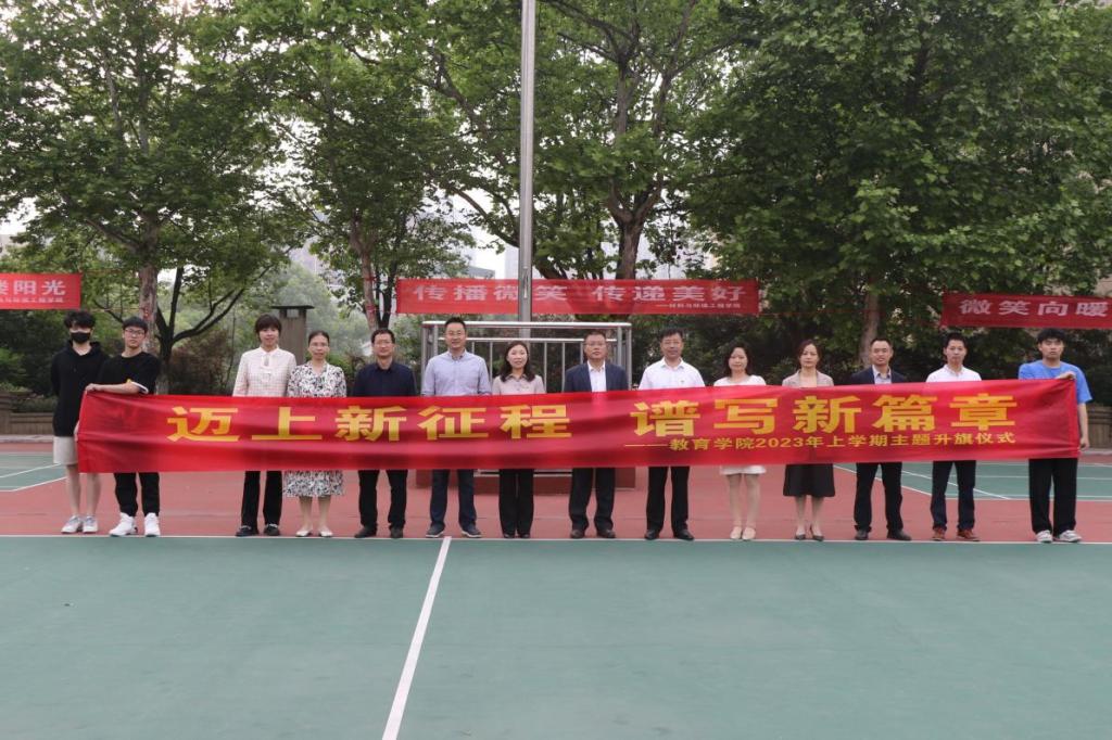 5月15日清晨,教育学院在学校宇光球场举行了“迈上新征程谱写新篇章”的主题升旗仪式。学工处副处长谢四元、曹宇、科长宋双,学院党总支书记邹坤、院长刘超良、党总支副书记田密,副院长刘黎明,学院全体班主任及2020级、2021级、2022级学生参加本次升旗仪式。升旗仪式由学工办主任李佳维主持。