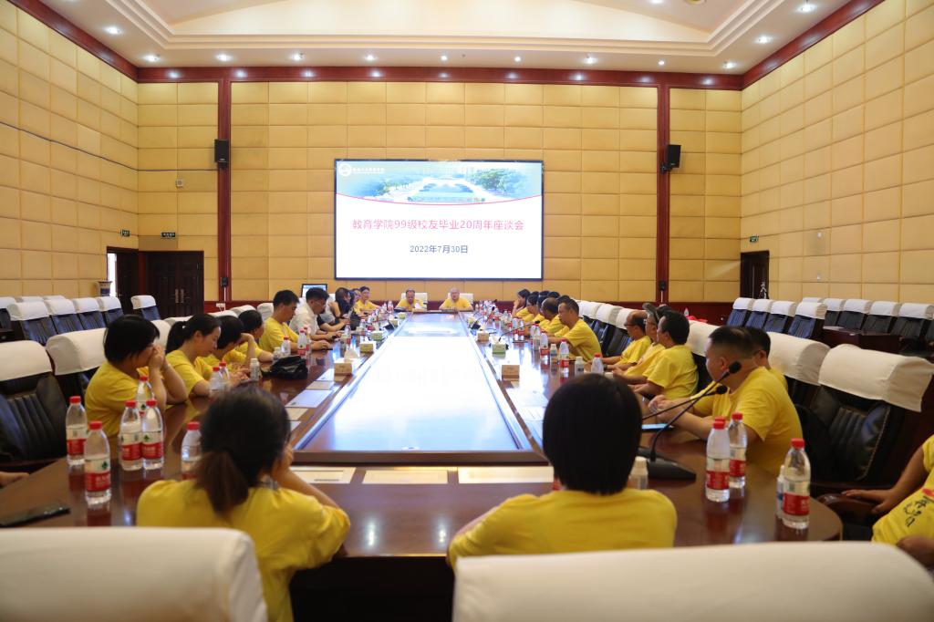 7月29日-30日,教育学院1999级校友毕业20周年回母校交流,为学校捐赠文化纪念石,并在图书馆一报告厅召开“二十年正青春,再聚首”同学座谈会。校长刘铁铭为文化纪念石题词“学而知道,教而成德”。校友办主任刘莉,教育学院党总支部书记邹坤、院长刘超良,原学院领导及班主任周月朗、吴智斌,校友代表40余人参加座谈。