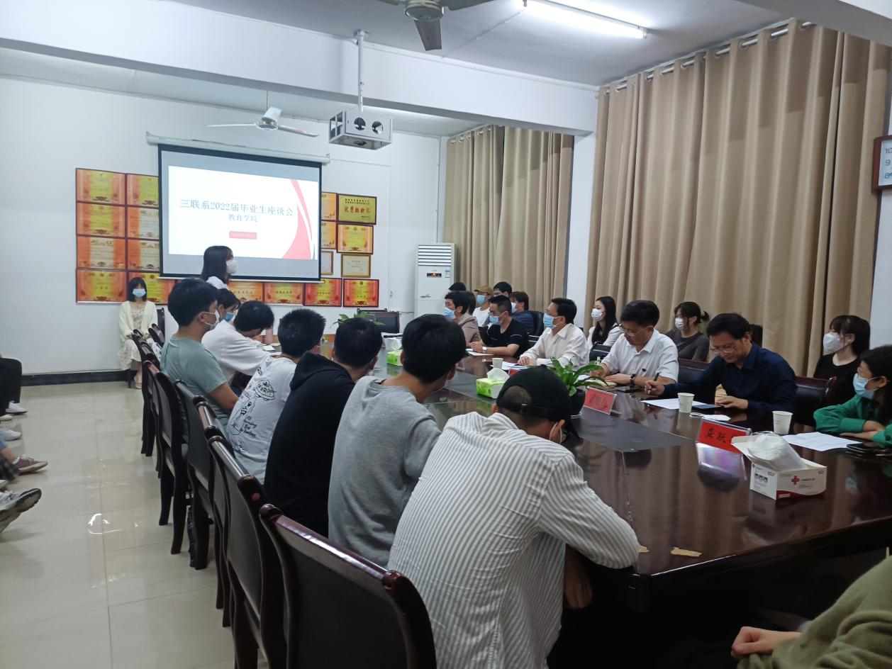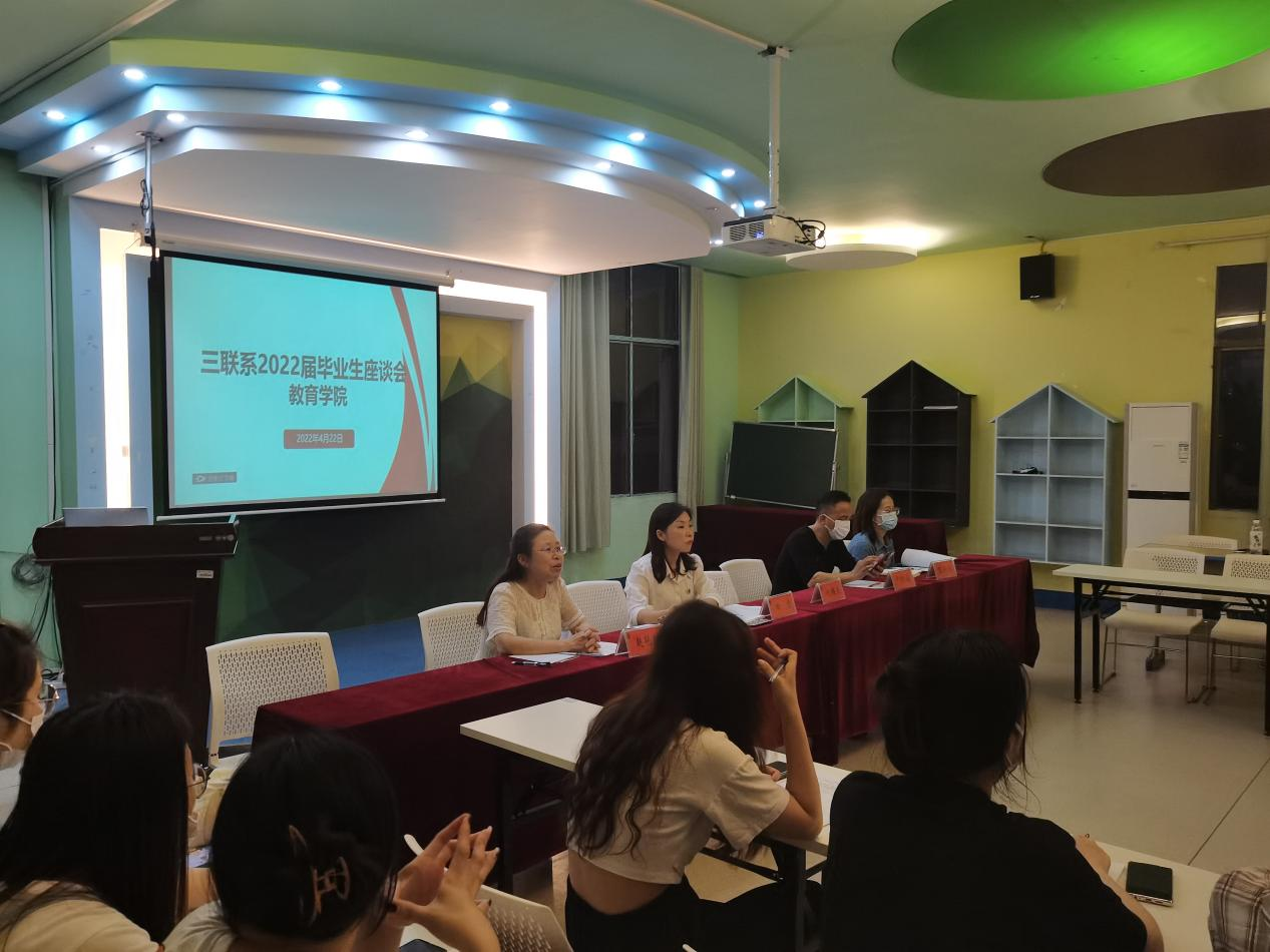 4月27日晚上,学校党委委员、副校长陈志国与学工处、继续教育学院等部门领导教育学院开展“三联系”2022届毕业生座谈会,指导毕业生就业创业工作了解学生学习、生活工作上困难帮助学生解决急难愁盼问题学院全体领导、教研室主任、毕业班班主任、辅导员2018级在校全体毕业生150余人,应心、学前(学合)、人教”专业分为三个会场座谈交流,党总支书记邹坤、副书记田密、副院长曹俊军分别主持,学校优秀校友、易禾公司董事长易胜其应邀参加。