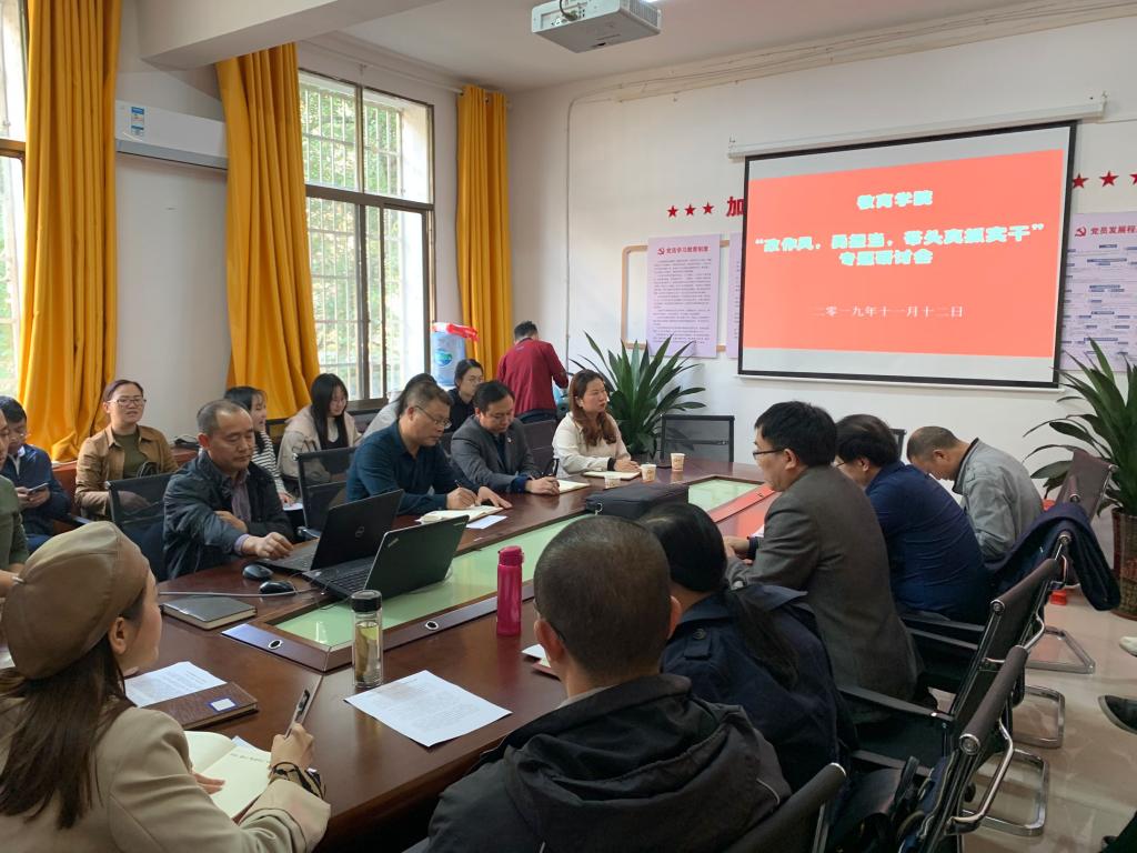 11月5日下午,教育学院党总支在204党员活动室举行“改作风,勇担当,带头真抓实干”集中学习,学习由党总支书记周月朗主持,学院全体教师党员学习。