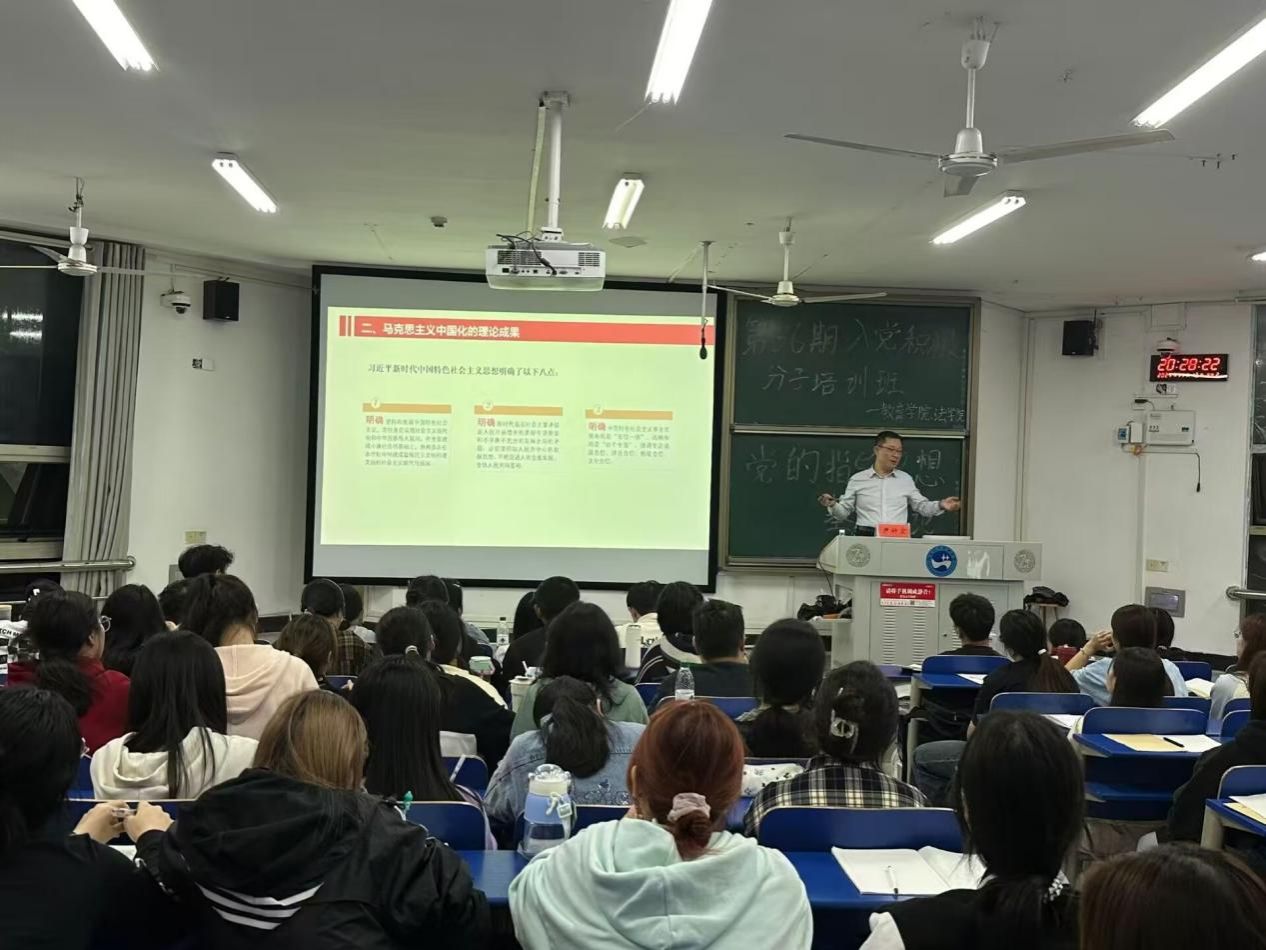 第一堂课由文学院书记尹钟宏为入党积极分子讲解党的指导思想、基本理论两部分基本内容,他通过讲述马克思列宁主义是科学的理论体系及马克思主义中国化的理论成果进行授课,有效强化了学员们坚定跟党走的意识。