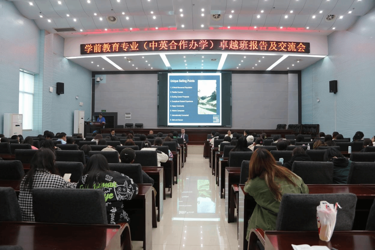 11月27日上午,教育学院联合巴斯斯巴大学教育学院在学校图书馆第二报告厅召开学前教育(中英合作办学)专业卓越班报告及交流会。巴斯斯巴大学国际部主任Mr. Benjamin Samuel Hughes、国际招生与合作负责人 Ms. Jiemin Tomita,学校党委委员、副校长陈志国,国际合作与交流中心主任黄敏,教育学院党总支书记邹坤、院长刘超良、副书记田密、副院长曹俊军、刘黎明,2021、2022、2023级卓越班学生参加交流会。