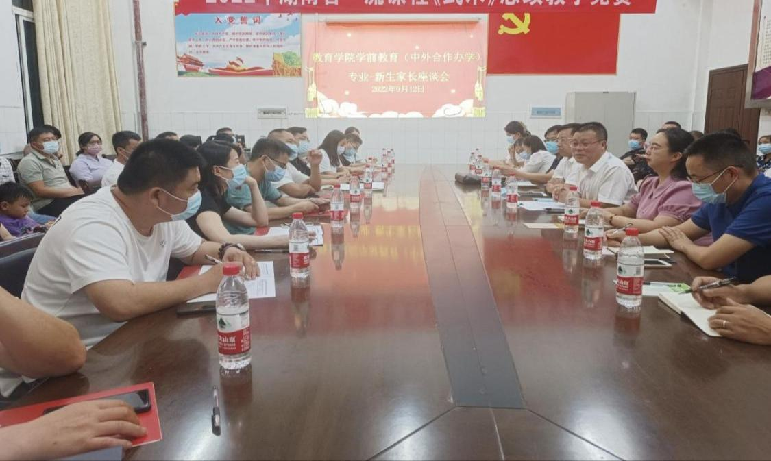 9月12日晚,教育学院在学校体育馆105会议室召开“2022级学前教育(中外合作办学)专业家长座谈会”,国际合作与交流中心主任黄敏,教育学院党总支书记邹坤、副书记田密,副院长曹俊军、刘黎明,学前教育教研室主任赵艳红,全体辅导员,全体新生班班主任,2022级学前教育(中外合作办学)部分新生家长参会,会议由院长刘超良主持。