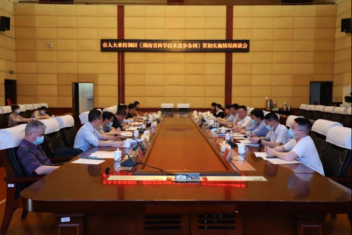 4月26日,娄底市人大常委会副主任朱桂良一行来校调研《湖南省科学技术进步条例》贯彻实施情况。副校长朱强出席座谈会,党政办、科研处、校地校企合作处、先进钢铁材料技术国家工程中心华中分中心、创新创业学院、材料与环境工程学院、农业与生物技术学院、能源与机电工程学院等部门负责人陪同调研。