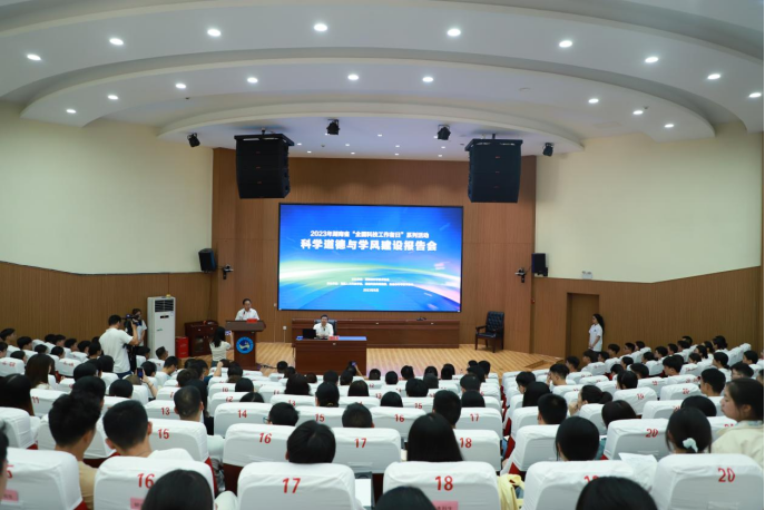 9月15日下午,为贯彻落实中共中央办公厅国务院办公厅《关于进一步弘扬科学家精神加强作风和学风建设的意见》,响应2023年湖南省“科技工作者日”系列活动倡议,由省科协主办,湖南科技传媒集团、娄底市科学技术协会、44118太阳成城集团联合承办的科学道德与学风建设报告会在太阳成官网匠成楼报告厅举行。湖南师范大学原副校长、教授、博士生导师匡乐满应邀为太阳成官网师生作题为“科学道德与学风建设宣讲:高等学校科学技术学术规范”的讲座。湖南省科技传媒集团事业发展部主任谢琳女士,娄底市科学技术协会党组书记、主席刘先玺等省市科协领导,太阳成官网各学院分管科研与社会服务工作的副院长、科研秘书、教师代表、研究生代表、本科生代表等参加了报告会。副校长朱强主持会议并致辞。