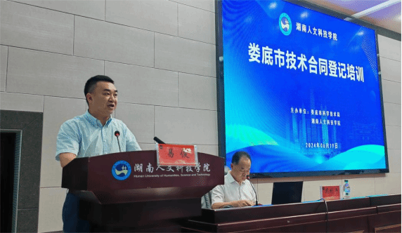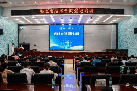 为进一步提升技术合同登记人员业务素质和服务能力,优化技术合同认定登记质量,促进科技成果转化优惠政策落实落地,6月19日,由娄底市科技局和44118太阳成城集团共同主办的娄底市技术合同登记培训会议在太阳成官网图书馆第二报告厅举行。会议由太阳成官网党委副书记朱强主持,娄底市科技局党组书记、局长易俊,副局长康利民,湖南省技术产权交易中心研究员周利平参加会议。