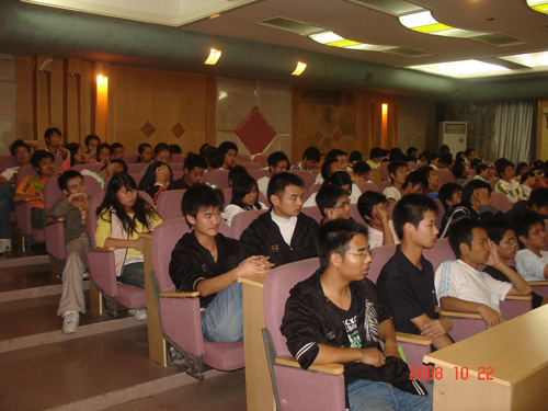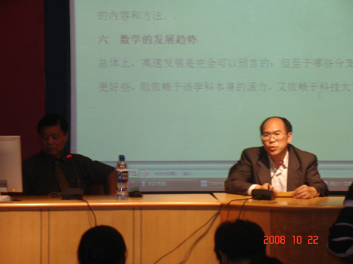 2008年10月22日晚湖南师大的博士生导师、国家有突出贡献专家、终身教授杨向群教授在太阳成官网现代技术教学楼多媒体报告厅进行讲座《漫谈今日数学》。讲座由数学与应用数学系主任陈国华博士主持,参加讲座的有数学系领导、学生辅导员、班主任老师及全体08级学生和部分07级学生。