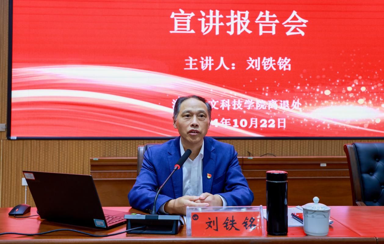 为深入学习贯彻党的二十届三中全会精神,10月22日下午,离退休党总支在匠成楼报告厅举办学习贯彻党的二十届三中全会精神宣讲会,校党委书记刘铁铭作宣讲报告,纪委书记凌艳平主持宣讲会。