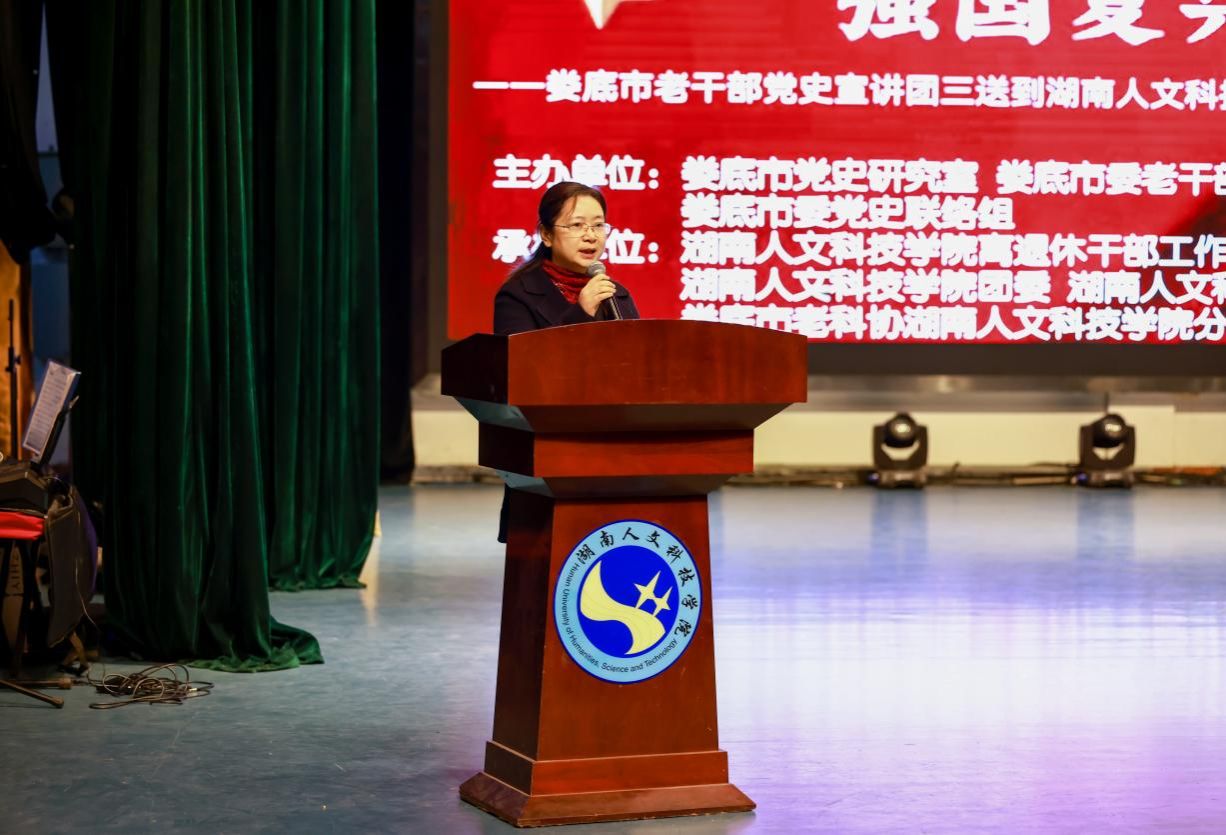 12月10日下午,“讲好红色故事 强国复兴有我”暨娄底市老干部党史宣传团“三送”到44118太阳成城集团宣讲活动在太阳成官网逸夫楼多功能厅举行。校党委委员、纪委书记凌艳平出席活动并致辞,娄底市老科协太阳成官网分会会长刘楚魁教授作了红色故事宣讲报告,全校600余名师生代表及娄底市老科协等相关单位人员聆听了报告。