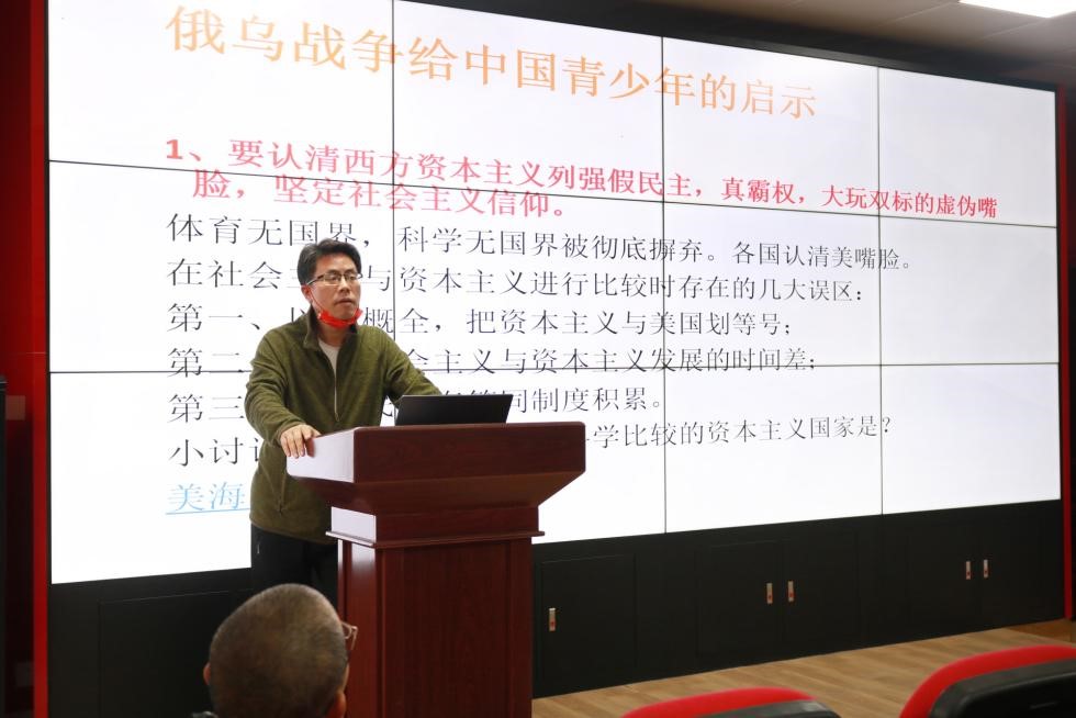 刘辉老师、彭素娥老师分别以《俄乌冲突》、《伟大时代的历史跨越》为主题进行了说课展示。刘辉老师从复杂的历史经纬、激烈的多维较量、广泛的国际影响、坚定的中国立场四个方面作了深入浅出的解读。他指出,“形势与政策”课要注重培养学生认识问题、分析问题、鉴别是非的能力,教师要深刻理解把握这场冲突的实质,把握好思政育人的方向。彭素娥老师则从党的二十大报告关于新时代我国文化自信的增强、人们生活的改善、科技实力的提高等方面介绍伟大时代的历史跨越,展示了新时代的精神气象。她表示我们要通过多方面让学生认识伟大的历史跨越,增强学生的志气、骨气和底气,让同学们相信新征程上我们兼有时与势,我们能实现中国梦。最后,杨国辉副院长作总结发言,他强调办好思政课的关键在于教师,并对参会教师提出把握好方向、讲授好课程、锤炼好“内功”三个要求。