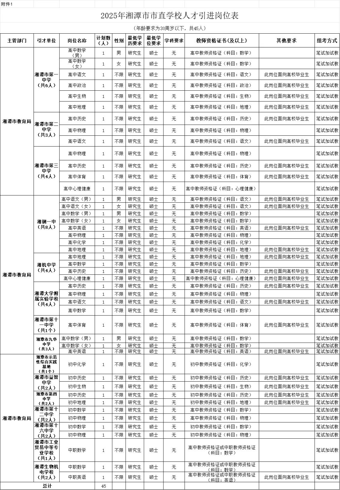 为深入实施“三高四新”战略,贯彻落实《莲城人才行动计划》《湘潭市市直事业单位急需紧缺专业人才引进实施办法》和《湘潭市加强教育人才队伍建设实施办法》,根据《事业单位人事管理条例》(国务院令652号)和《湖南省事业单位公开招聘人员办法》(湘人社发〔2025〕1号)要求,为进一步加快教育人才聚集,推动湘潭教育高质量发展,现组织开展2025年湘潭市市直学校人才引进工作。现将相关事宜公告如下: