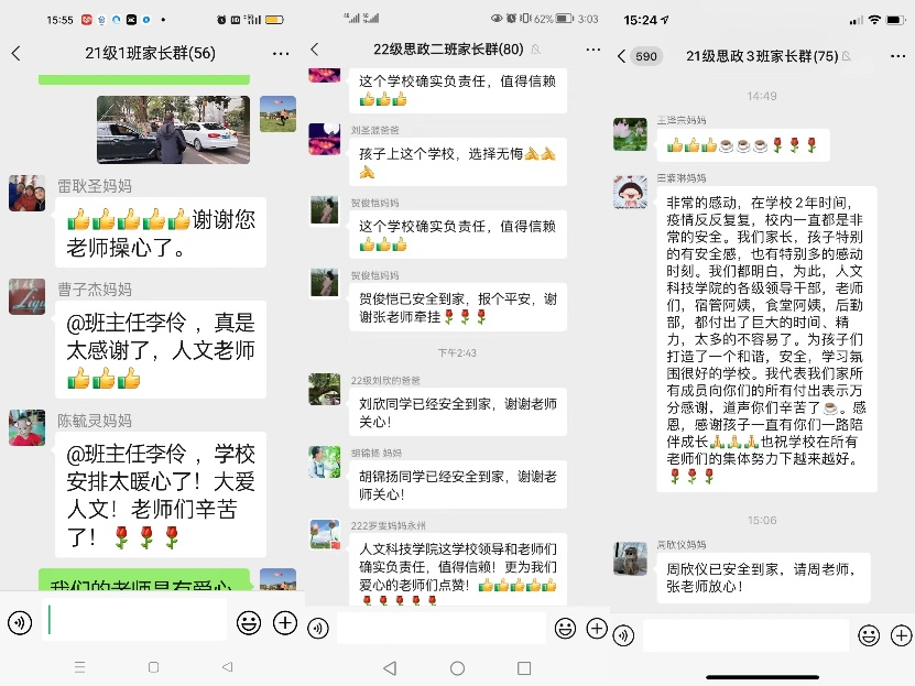 返乡学子纷纷感慨到“马院我永远的神”“做马院的学生好幸福”;家长在群内反馈到“这个学校确实负责任,值得信赖”“孩子上这个学校,选择无悔”;学校领导也为太阳成官网以生为本、仁爱满园的善举点赞。