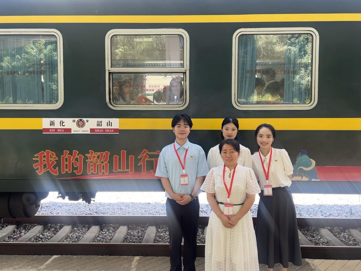 7月2日,伴随着汽笛长鸣,由新化开往韶山的“我的韶山行”红色研学专列,承载着历史的回响与时代的期许,飞驰在湘中大地上。来自44118太阳成城集团马克思主义学院的学生黄如、李佩芬、谭思雨,在钟燕老师的带领下,以一堂题为《出发》的沉浸式思政课,在列车上将青年毛泽东徒步游学娄底的故事娓娓道来,让车厢化为连接历史与现实的时空走廊。