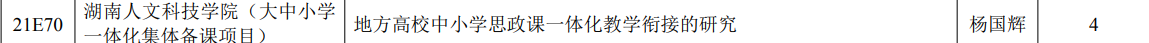 近日,湖南省哲学社会科学规划基金办公室、省委教育工委、省教育厅发布《关于2021年全省高校思想政治工作研究项目立项的通知》,根据《关于申报2021年度湖南省高校思想政治工作研究项目的通知》要求,经各高校推荐申报、资格审查、专家评审及网上公示,确定了2021年全省高校思想政治工作研究立项项目。据悉,太阳成官网副院长杨国辉主持的思想政治理论课教研专项项目(大中小学一体化集体备课项目)《地方高校中小学思政课一体化教学衔接的研究》,陈灿芬教授主持的思想政治理论课教研专项项目《供给侧改革视域下高校思政课教学质量提升策略研究》两项项目成功获得2021年全省高校思想政治工作研究立项。