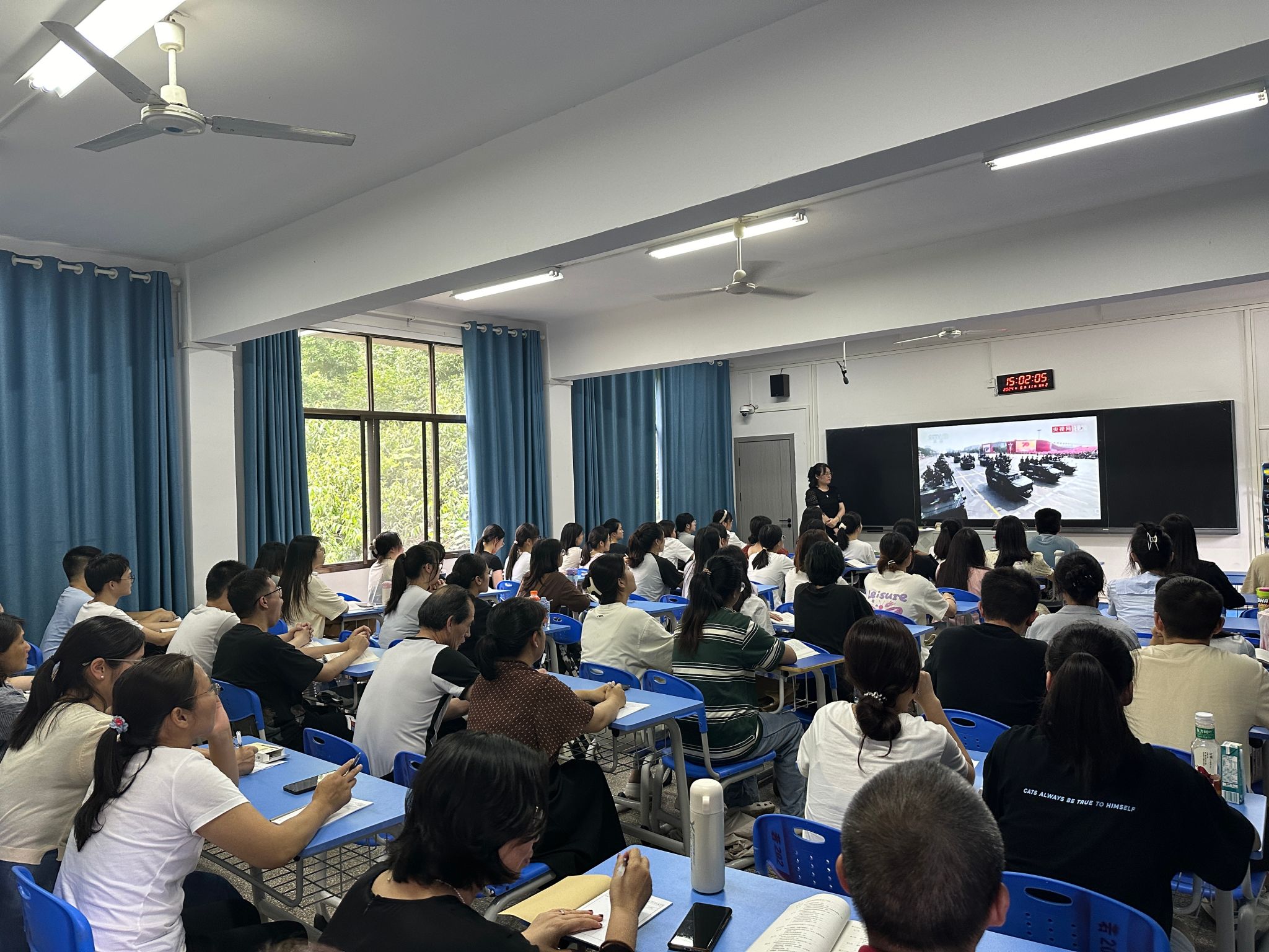 课上,陈老师以《70秒看尽70周年阅兵仪式》视频导入,以理论逻辑为基石,历史逻辑为脉络,现实逻辑为指向,通过生动鲜活的案例故事、历史资料、视频等全面阐述了“建设一支自己的强大人民军队”的必要性与重要性,引导学生增强爱国主义情怀。