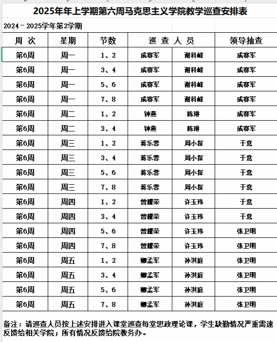 为进一步推进思想政治理论课课程建设,马克思主义学院开展了为期两周的教学巡查,院长于意,副院长成赛军带队参加。