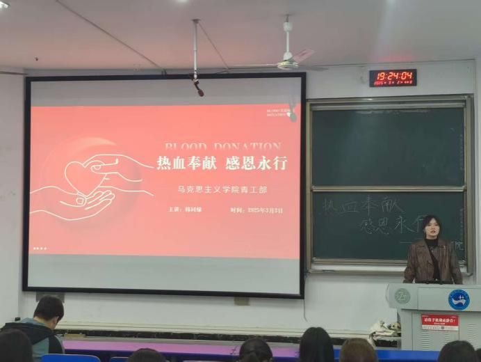 3月2日晚,马克思主义学院2024级全体同学于致远楼进行“热血奉献,感恩永行”为主题的献血动员活动。本次活动旨在普及无偿献血的相关知识,弘扬无私奉献的精神,增强高校青年的社会责任感与奉献意识。