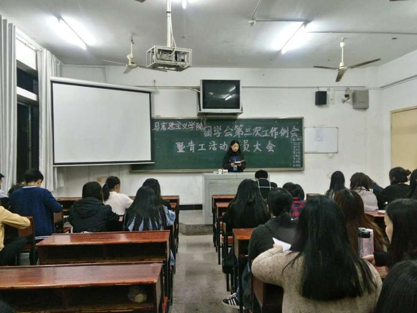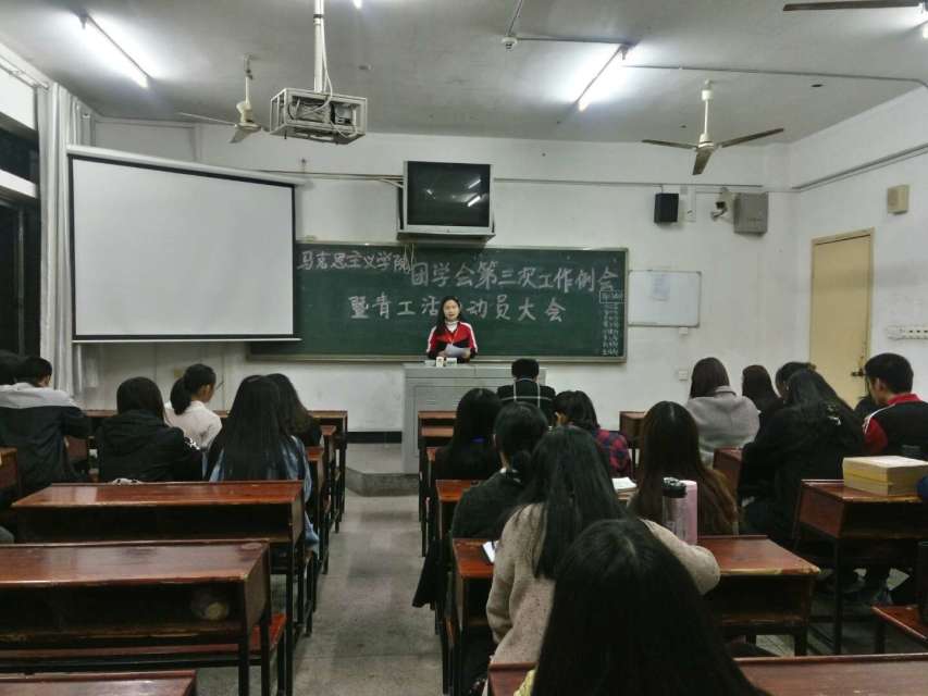 会议分三项进行。首先,青工活动主策划人匡巧上台发言。她介绍了青工活动的活动形式以及相关工作需注意的事项,并表示希望此次活动各部门能齐心协力,相互配合,表现出马克思主义学院团学会的团结精神。其次,团总支副书记苏恬上台讲话。她要求我们严格遵守此次活动的纪律,做到不迟到不早退,以积极饱满的态度投入到此次活动中去。争取本次青工活动圆满完成。最后,各部门部长上台做工作总结和未来工作计划。部长们对本部门的工作进行了深刻总结和计划安排,保证了各部门之间工作有序开展。