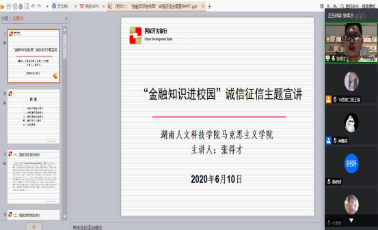活动由主题征文、观看诚信教育宣传片和助学贷款专题讲座三个环节组成。首先,6月3日至6月8日为主题征文环节,大家积极踊跃投稿,讲述了自己对诚信问题的看法并分享了与助学贷款的故事。经过评委评审,高俊凤等10名学生获此次征文奖。随后,由张得才老师组织全院学生观看诚信教育宣传片,了解遵守诚信的重要意义。最后,于6月10日通过腾讯会议举行“金融知识进校园”诚信征信专题讲座,由辅导员张得才主讲,全院申请了助学贷款和想申请助学贷款的学生参加。张得才老师对助学贷款申请和续贷、还款问题进行了详细解读,重点强调了贷款后的诚信及个人征信问题,并讲述了一些真实案例,提高了同学们对诚信问题的理解与重视。