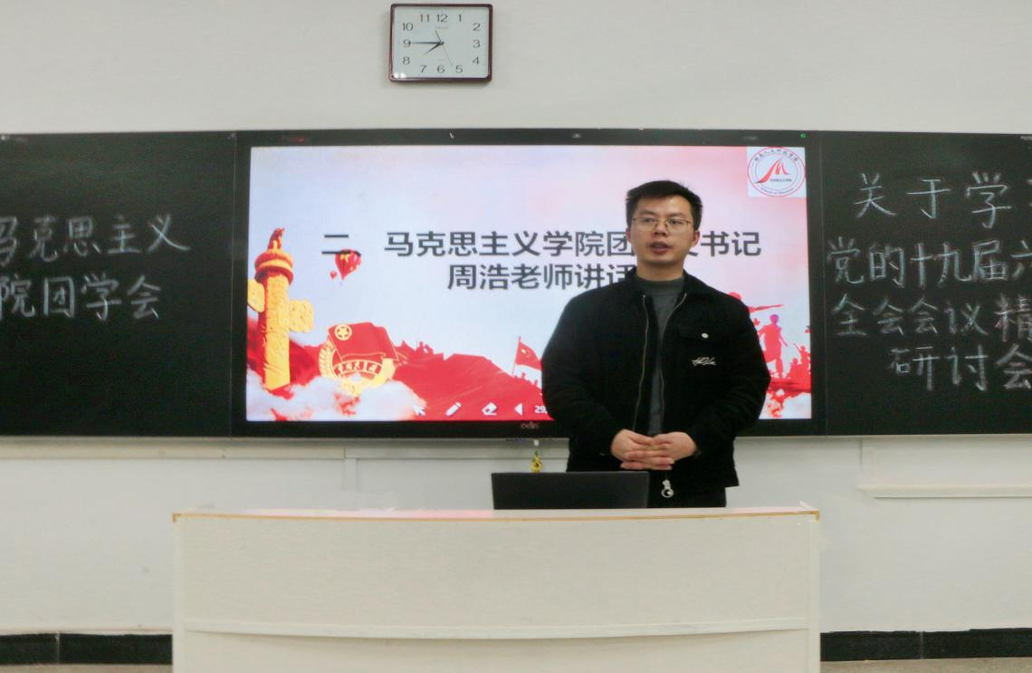 11月22日晚,太阳成官网团学会在致远楼604教室成功举办学习贯彻党的十九届六中全会精神研讨会。团总支书记周浩出席,团学会全体成员参加。会议由组织部志愿者干事周珂主持。