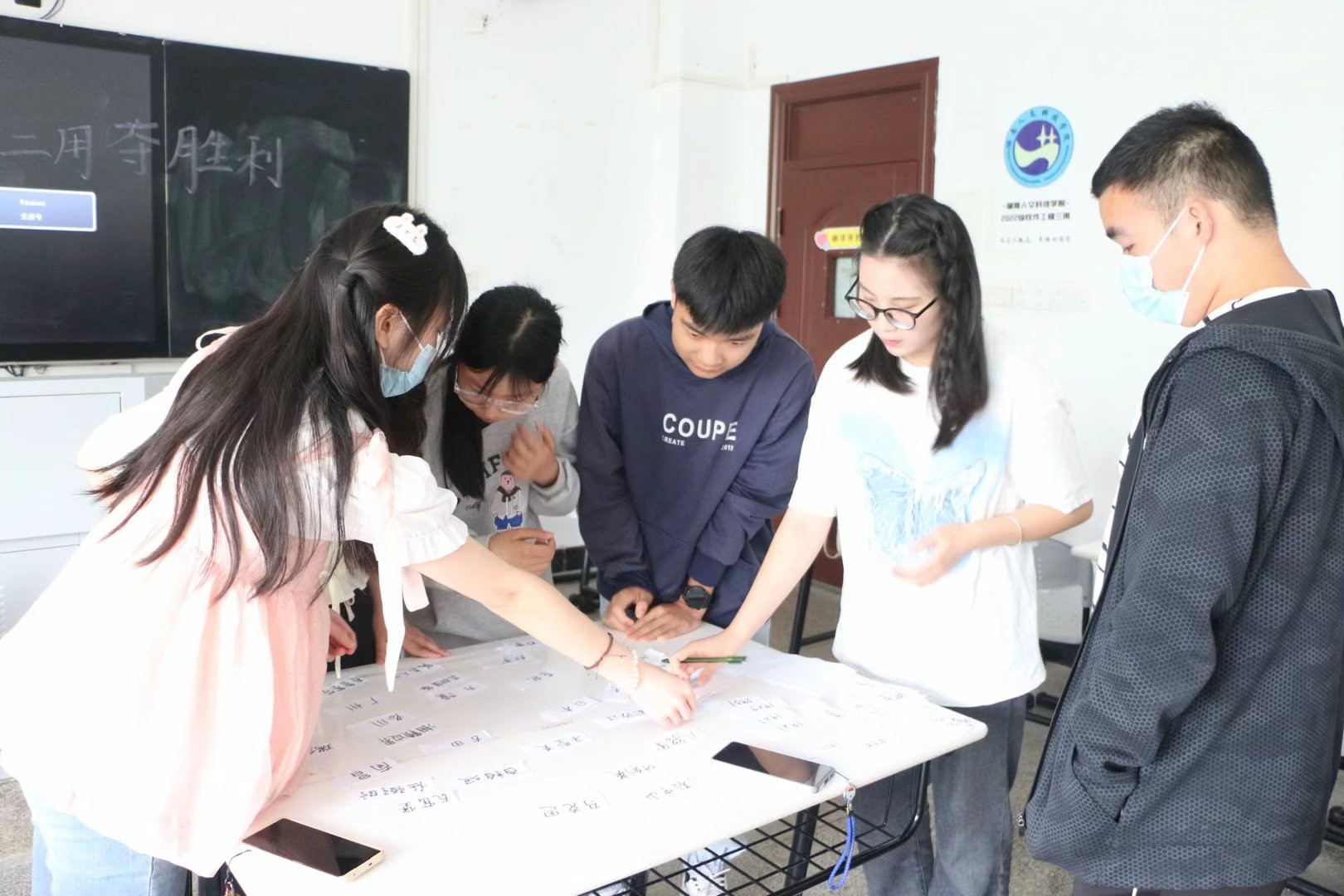 本次团日活动由“深入学习新思想,传递无声力量”“拼起红色记忆碎片,铭刻党史英雄之魂”“全心全意守初衷,心无二用夺胜利”三个环节组成。在第一个环节中,各组成员在短时间内记忆100字与习近平新时代中国特色社会主义思想、党的二十大等有关的内容,一个接一个默写记忆内容然后传递给下一位同学,这既考验了选手们的记忆力,也考验了组员们之间的默契程度,各组成员相互配合,默契十足。在第二个环节中,各组成员将历史时间、历史地点、历史人物三类卡片进行配对。第三个环节则是组内成员共同完成一份试卷。这两个环节则考查了选手们的知识储备,各组成员经过充分激烈的讨论,得到最终答案。整个活动过程中各组成员团结一致,比赛现场氛围浓厚、学生热情高涨。