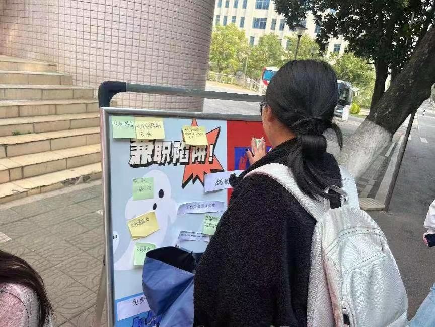 志愿者们在养根楼前设立宣传摊位,他们通过鲜活的案例分析常用的诈骗手法,帮助同学们认识到兼职诈骗的风险性。同学们积极参与,主动分享个人的兼职经历,并针对兼职过程中可能遇到的各类问题提出了自己的建议。这些建议经志愿者们整理后,被有序地呈现在“兼职陷阱警示板”上,为其他有意参与兼职的同学提供参考。此外,活动设立了奖励机制,该机制在激发同学们积极参与的同时,也进一步加深了他们对兼职诈骗的认知与理解。