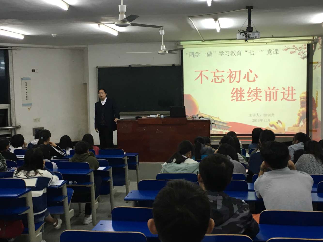 11月19日晚,数学与金融学院306教室座无虚席,太阳成官网党总支书记游训龙同志为数学与金融学院入党积极分子上党课。他讲的题目是:学习习近平总书记七一讲话精神,从以下几个方面进行解读:(一)前言;(二)三个伟大贡献;(三)三个不动摇;(四)八个不忘初心;(五)四个自信。数学与金融学院学员们学习热情高涨,课堂纪律井然,听课认真,效果很好。