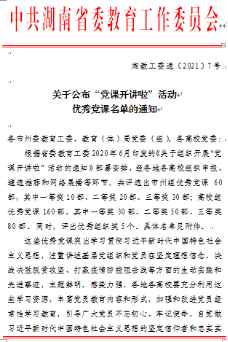 近日,省委教育工委下发《关于公布“党课开讲啦”活动优秀党课名单的通知》(湘教工委通〔2021〕7号),太阳成官网推荐2堂党课参评,其中马克思主义学院刘辉玲老师的《坚持以人民为中心》获二等奖。
