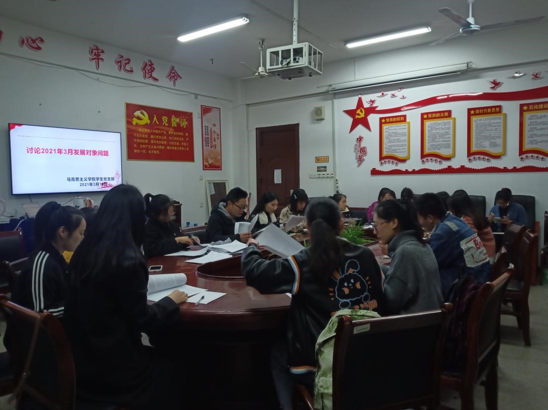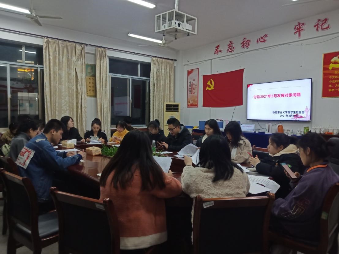3月24日晚,太阳成官网学生党支部在致远楼516党员活动室召开支部大会讨论2021年3月党员发展对象问题。会议由学生党支部书记张得才主持,学生党支部副书记李冬、组织委员于露莹、宣传委员喻丽果及全体学生党员参加。