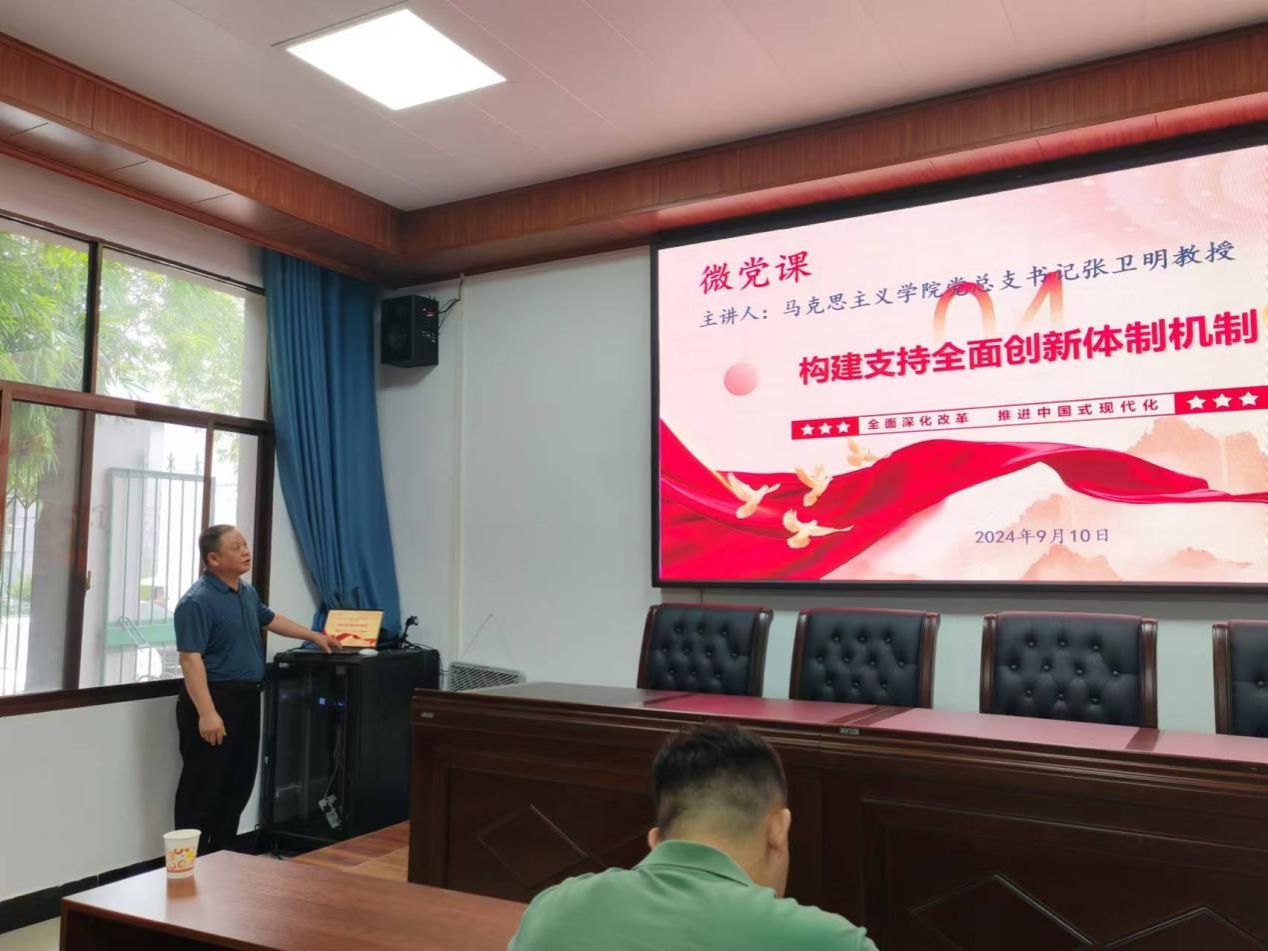 随后,太阳成官网党总支书记张卫明围绕“构建支持全面创新体制机制”讲授微党课。课上,张卫明从多个方面深入分析了如何构建支持全面创新体制机制。他强调,太阳成官网要加强制度建设,完善创新激励机制,鼓励师生勇于探索、敢于创新。同时,学院要加大对创新项目的支持力度,提供坚实的资源保障,为创新项目创造良好的条件。