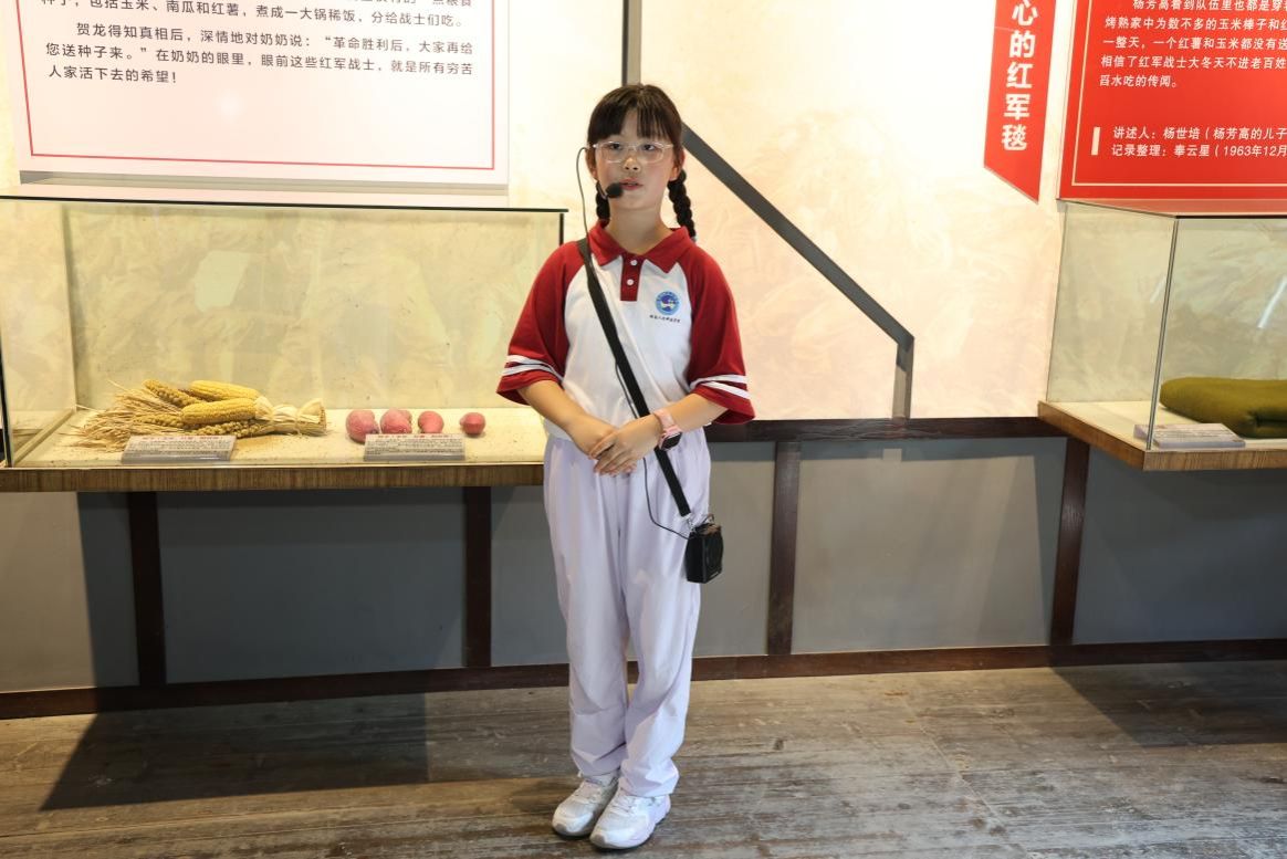 调研团成员们在直播中重点讲述了“种子稀饭”“一床暖心的红军毯”“火把燃尽送马灯”等感人故事。在这场“云长征”直播宣讲中,调研团有一位特殊的小主播——来自长沙市岳麓区第一小学的肖雨洋小朋友,她用生动的语言和丰富的肢体动作为观众讲解“种子稀饭”的故事。她说,“奉光珍奶奶拿出留作次年播种的珍贵种子,为红军熬粥的行为让我深受感动,我要用自己的方式把这个故事讲出来让更多的人知道。”肖雨洋的讲解让观众从不同的视角更真切地体会到当时红军“不拿群众一针一线”的铁纪温情与军民双向奔赴的鱼水情深。调研团成员杨芊意对此感慨道:“洋洋的讲解太棒了,这就是我们学校一直在推进的大中小思政一体化在实践中的生动体现啊!”