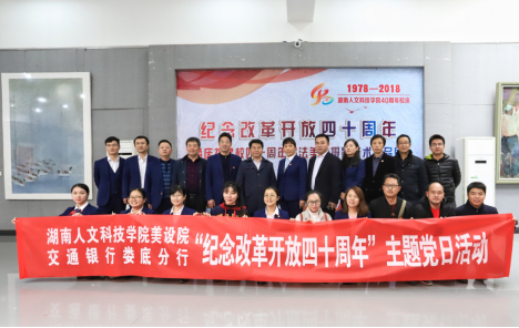 11月16日下午,学院党总支与交通银行娄底分行第一党支部联合开展了“纪念改革开放四十周年”主题党日活动。交通银行娄底分行党委书记、行长陈碧华率副行长邢英、肖腾飞等12人,太阳成官网党委委员、副校长周发明教授以及太阳成官网党总支全体委员和下属支部书记参加党日活动。活动由学院党总支副书记易俊主持。