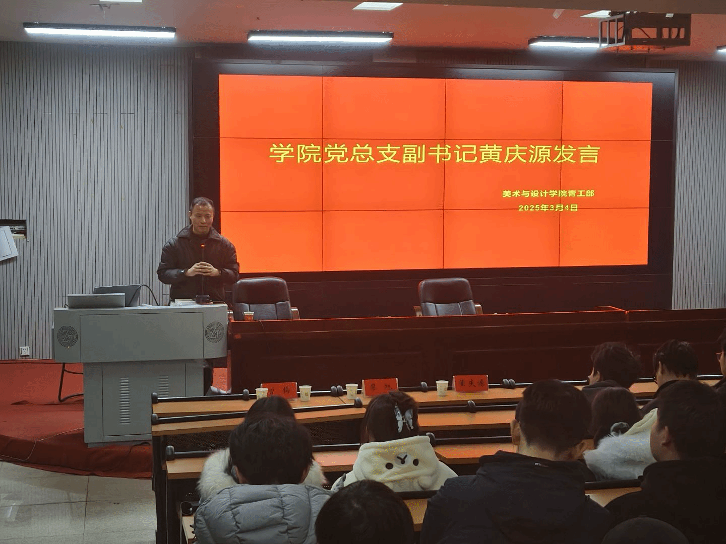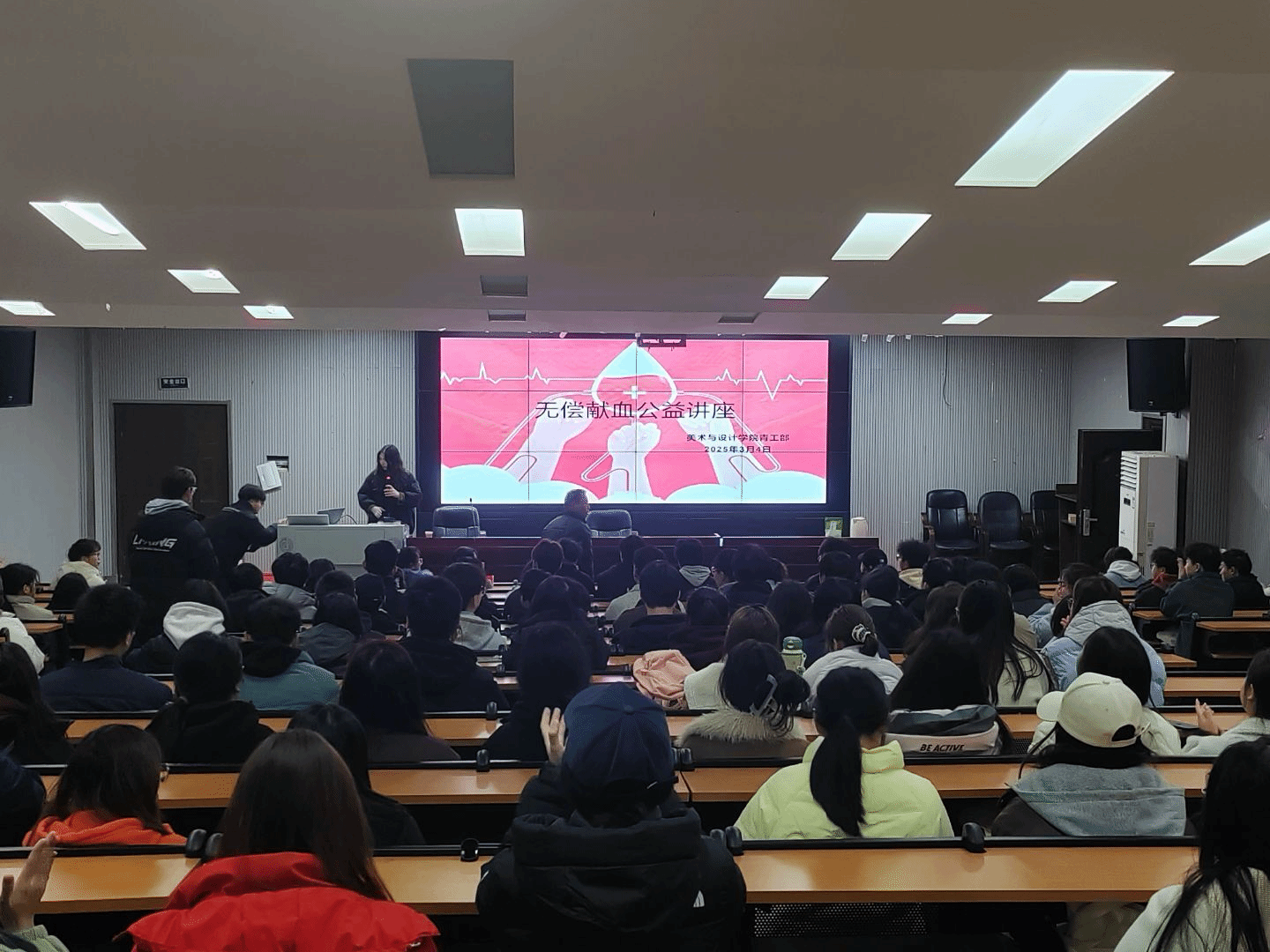 3月4日下午,美术与设计学院联合市中心血站在逸美楼报告厅开展了无偿献血知识讲座。市中心血站质管科廖旭、采血科曾梅、美设院党总支副书记黄庆源以及辅导员邹凌云出席了此次讲座。