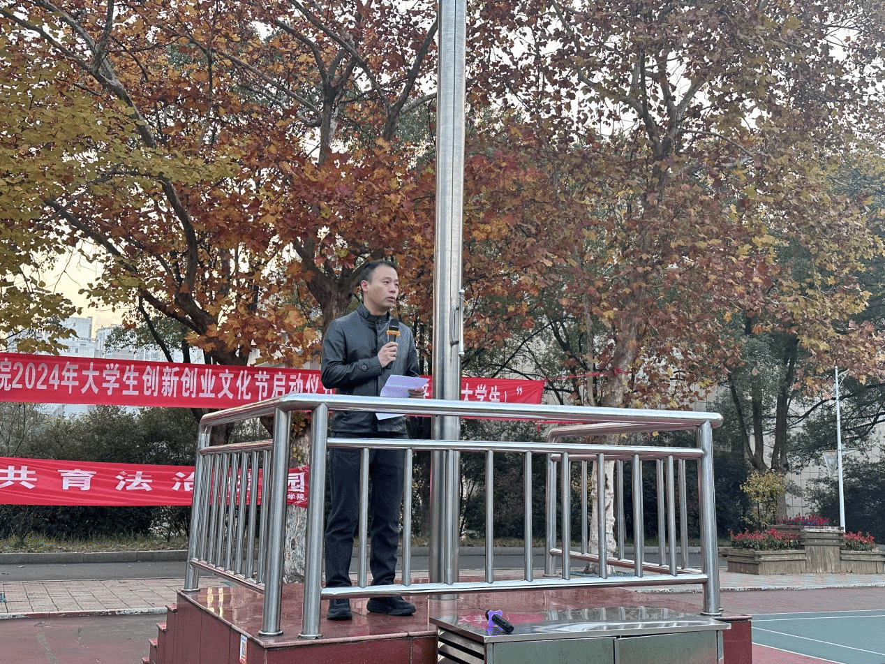 升完旗后,进行国旗下的演讲。首先由2024级书法二班学生代表谢佳霖讲话,她表示将积极参与到校园法治建设中来,为弘扬宪法精神贡献自己的力量。随后,学工办段洋明老师作为教师代表发表讲话,他提出新时代的青少年要学好文化知识,树立正确的法治观念。并呼吁全校师生共同营造一个学法、懂法、守法、用法的良好氛围,共建法治校园。最后,由美设院党总支副书记黄庆源作此次升旗仪式的总结,他结合当前社会形势和学校教育实际,强调弘扬宪法精神、共育法治校园的重要性,鼓励全院师生将法治精神内化于心、外化于行,共同为构建和谐、法治的校园环境不懈努力。