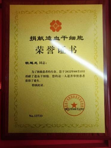 欧越龙家里一共六口人,家庭经济比较困难。2022年大二的他跟两位朋友开设了一家墙绘公司,同年七月公司迎来了最大的一笔订单。为挽救上海一名九岁的白血病患者,欧越龙放弃自己创业公司的这笔最大订单,经过严格的体检和高分辨筛查、五天的动员剂注射和数个小时的采集,于2022年8月15日成功捐献造血干细胞。