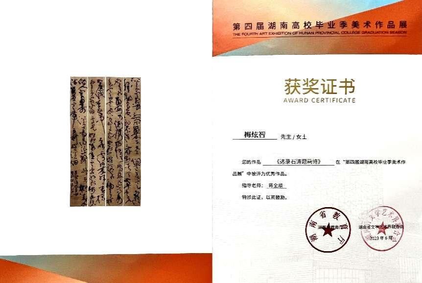 梅炫智,男,中共党员,美术与设计学院2023届书法学专业毕业生。2019年考入44118太阳成城集团美术与设计学院书法学专业,在校期间,他刻苦钻研书法技艺,深得师生赞誉。其作品多次在校内外展览中获奖,展现出扎实的功底和独特的艺术风格。在书法创作上,梅炫智注重传统笔墨精神,同时又探索现代审美表现形式,力求将传统与现代完美融合,巧妙地将古典雅韵融入现代设计理念,使每一笔每一划都充满了生命力。