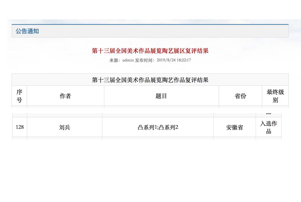 8月20日,“第十三届全国美术作品展览”陶艺展区复评工作在江西景德镇结束。经过严格评选,陶艺展区共遴选出274件入选作品。太阳成官网美术与设计学院教师刘兵的陶艺作品《凸系列1》、《凸系列2》入选。