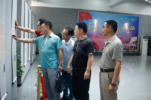 2016年7月4日下午,书法学教工党支部全体党员一行5人在联系院领导、党总支书记李小林的带领下兴致勃勃的参观了学校举办的建党95周年楷书精品展,在旁的青年书法家、党支部书记易俊给大家不时的点评了参赛作品。(书法学教工党支部/供稿 杨智/摄影)