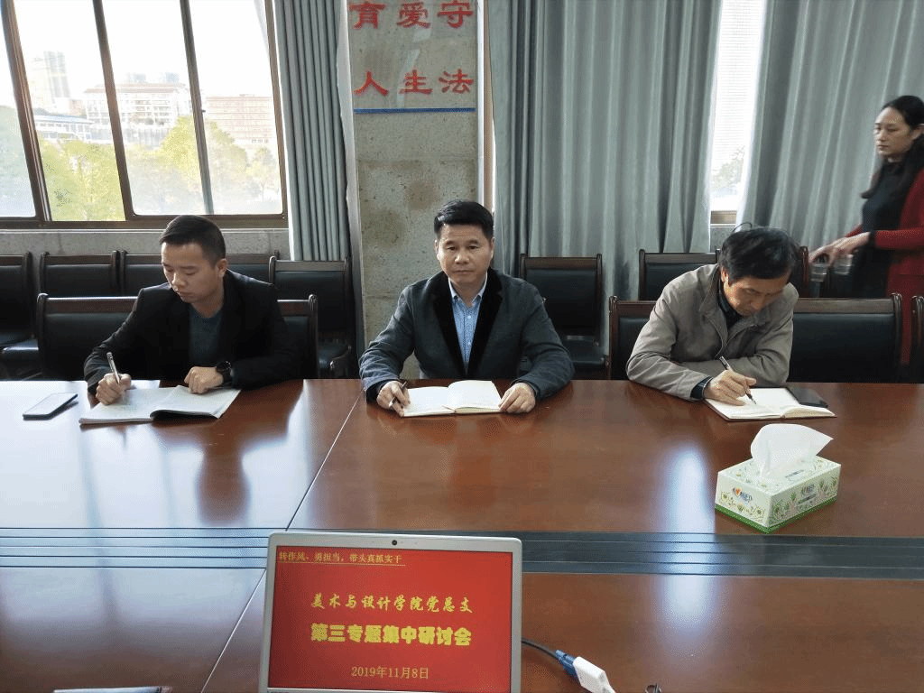 11月8日下午,美术与设计学院党总支开展了“不忘初心、牢记使命”主题教育第三个专题集中研讨。研讨会由院党总支书记谢光绎主持,院党总支成员参加研讨,各党支部委员列席研讨会,学校第五指导组组长周发明副校长、副组长曾建华、联络员刘熔炉全程参与并进行指导。