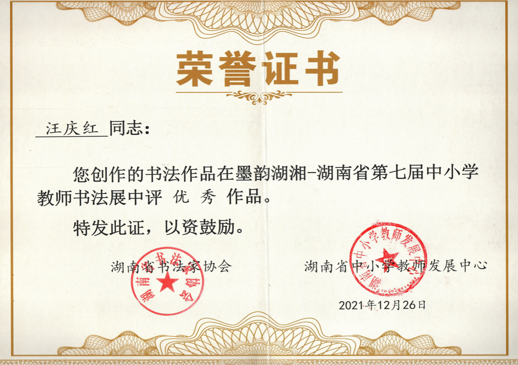 2021年获“墨润湖湘”湖南省第七届中小学教师书法作品展优秀奖。