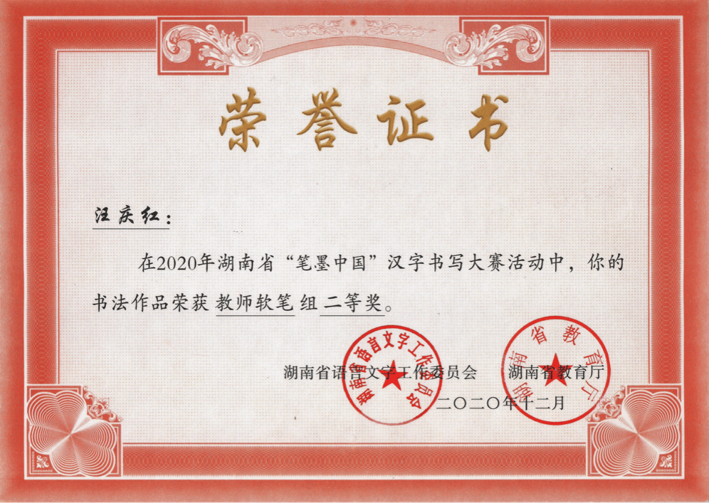 2020年获湖南省“笔墨中国”汉字书写大赛二等奖。