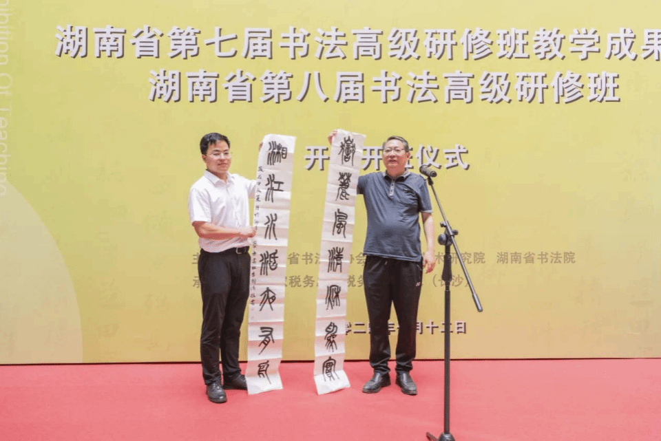 7月12日,湖南省第七届书法高级研修班教学成果展在国家税务总局税务干部学院(长沙)图书馆一楼展厅开幕,湖南省第八届书法高级研修班同步开班。本次高研班由省艺术研究院、省书法家协会、省书法院主办,国家税务总局税务干部学院(长沙)承办。