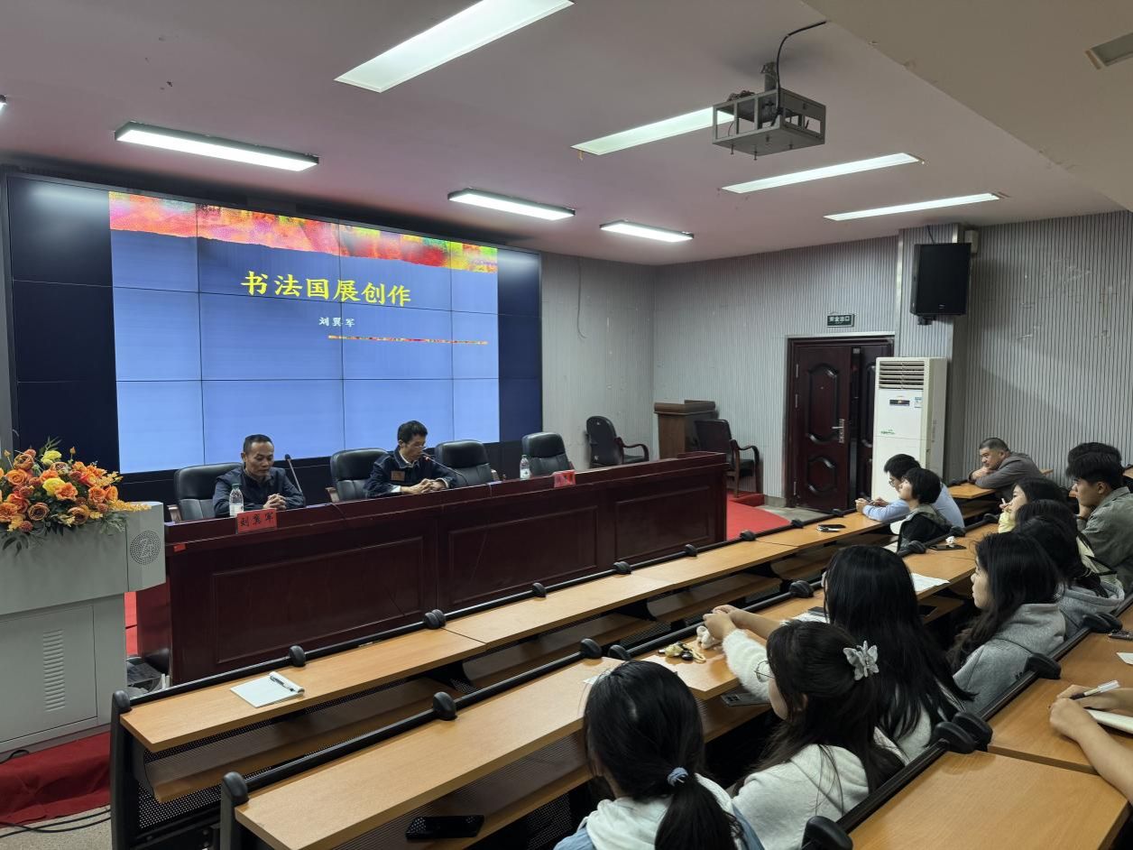 活动伊始,刘翼军老师从作品内容选择,笔墨纸的选择等多方面带领同学们揭开了“书法国展”的神秘面纱,拉近了他们与书法国展的距离。