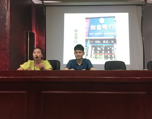 7月4日8:00,书法学教研室邀请感恩咨询服务公司董事长王谦先生,知音琴行艺术学校兼星海琴行艺术学校校长拜芳女士在美术系报告厅做“教育培训机构建设”讲座。讲座由党总支宣传委员彭建成主持,系主任邹少灵教授亲自出席,书法学专业校企合作教育带队教师以及书法学专业的全体学生参加了讲座。