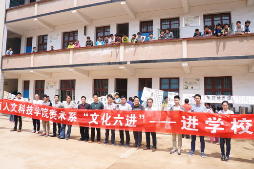 2015年4月16日,在湘乡市毛田镇党委委员分管教育工作的罗晴和毛田镇学区主任、联校校长刘学军的陪同下,美术系党总支书记李小林同志,湖南省油画协会理事、娄底市美协油画艺委会主任、美术系教工党支部书记、美术学教研室教师杨竟成副教授,全国著名书法家、娄底书法研究会副会长、美术系书法教研室主任、系工会主席易俊老师,美术系美术学党支部书记彭建成副教授,设计学党支部书记李兰及娄底市书法家、美术系教师蒋传存带领学生党员代表来到芬水中学开展“文化艺术进学校”活动,这是本日“文化六进”活动开展的第三站。