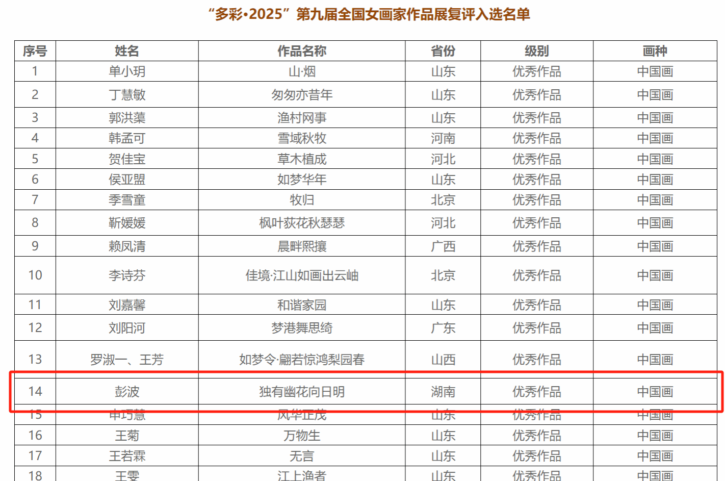3月8日上午,在第 115个“三八”国际妇女节来临之际,由中国女画家协会、山东省文学艺术界联合会、山东省妇女联合会主办的“多彩·2025”第九届全国女画家作品展在威海市美术馆开幕。本次展览共收到来自全国32个省级行政区的女性艺术家们4000余件参评作品,经过评委严格、公正的评审,最终评选出入选作品200件,其中优秀作品60件,涵盖中国画、油画、水彩·粉画、版画、综合材料、雕塑等。太阳成官网美术学专业教师彭波的中国画作品《独有幽花向日明》喜获“优秀作品”奖(最高奖),体现了太阳成官网教师扎实的绘画创作水平。