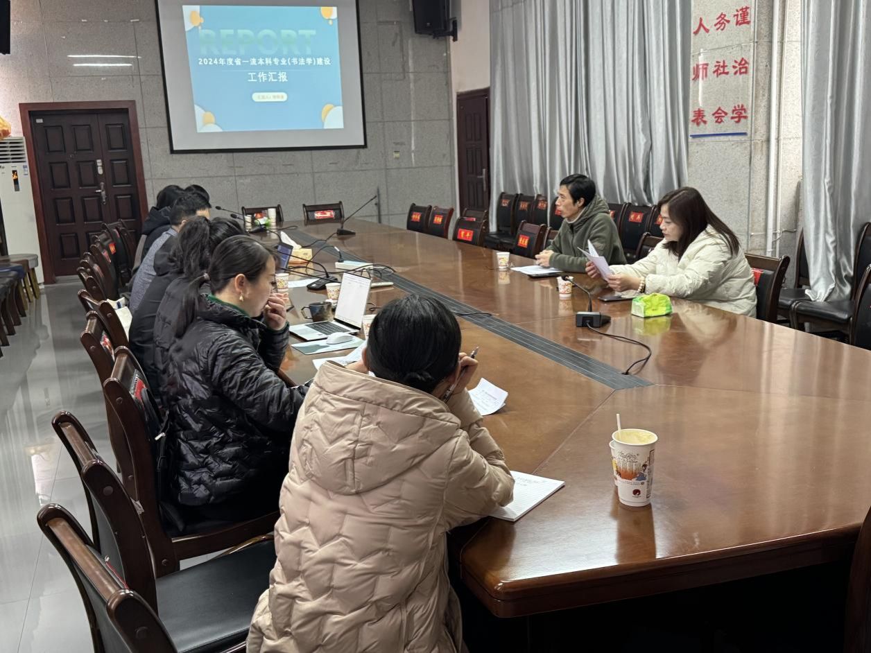 1月3日下午3点整,在美设院216会议室举行书法学专业省级一流本科建设成果汇报,院长陆序彦、副院长童玲、教研室主任和书法学教研室老师参加。首先书法学教研室主任李国清通过PPT的形式从专业建设情况、经费使用情况、存在问题分析、未来重点工作四个方面进行了汇报。在人才培养、师资队伍建设、教学资源优化、教师专业技能竞赛、学科竞赛以及学术研究与文化传承等方面亮点纷呈,专业建设方面书法学教研室老师们在2024年度取得了丰硕的成果,但是在省级教学成果奖、专著、教材等方面有所欠缺。