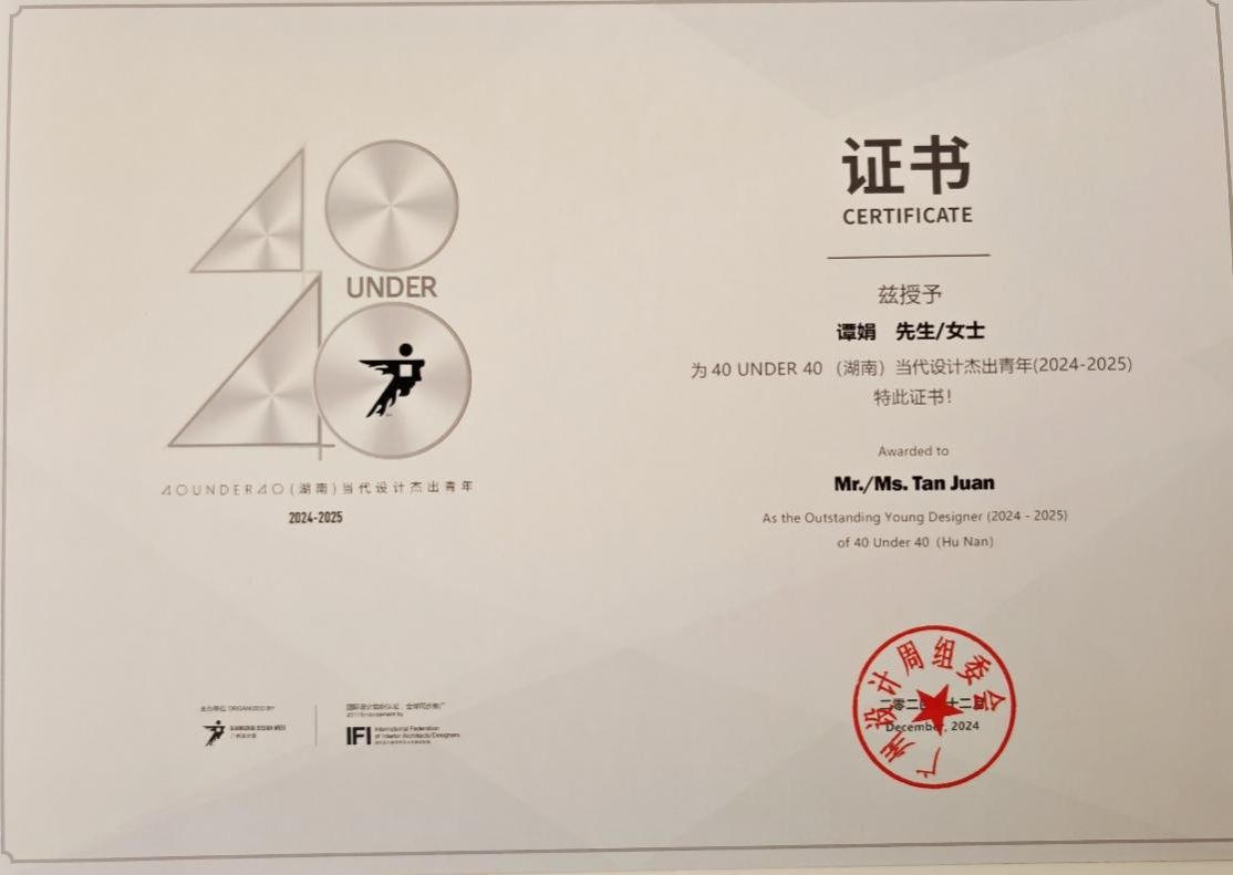 2024年湖南省40 UNDER 40当代设计杰出青年的证书