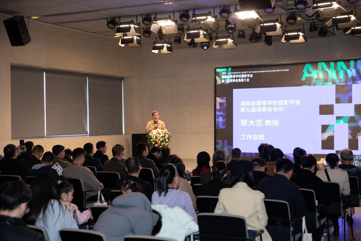湖南省高等学校摄影学会第七届会长黎大志教授,湖南师范大学副校长潘安练教授等领导嘉宾出席了本次大会。潘安练教授对大会的召开表示热烈祝贺。他充分肯定了学会在学科建设、一流课程开发以及优秀摄影人才培养方面的卓越成就,并提出希望学会能够积极探索文化与科技的融合发展路径,以影像科技助力湖湘文化的传承与创新。在会议过程中,湖南省高等学校摄影学会第七届理事会会长黎大志教授作了《湖南省高等学校摄影学会第七届理事会工作报告》,全面回顾了过去几年的工作成果,重点回顾了学会在活动开展、会员发展、摄影教育课程建设、对外交流合作以及学会内部管理等方面的进展,并向各位与会成员表达了感谢。