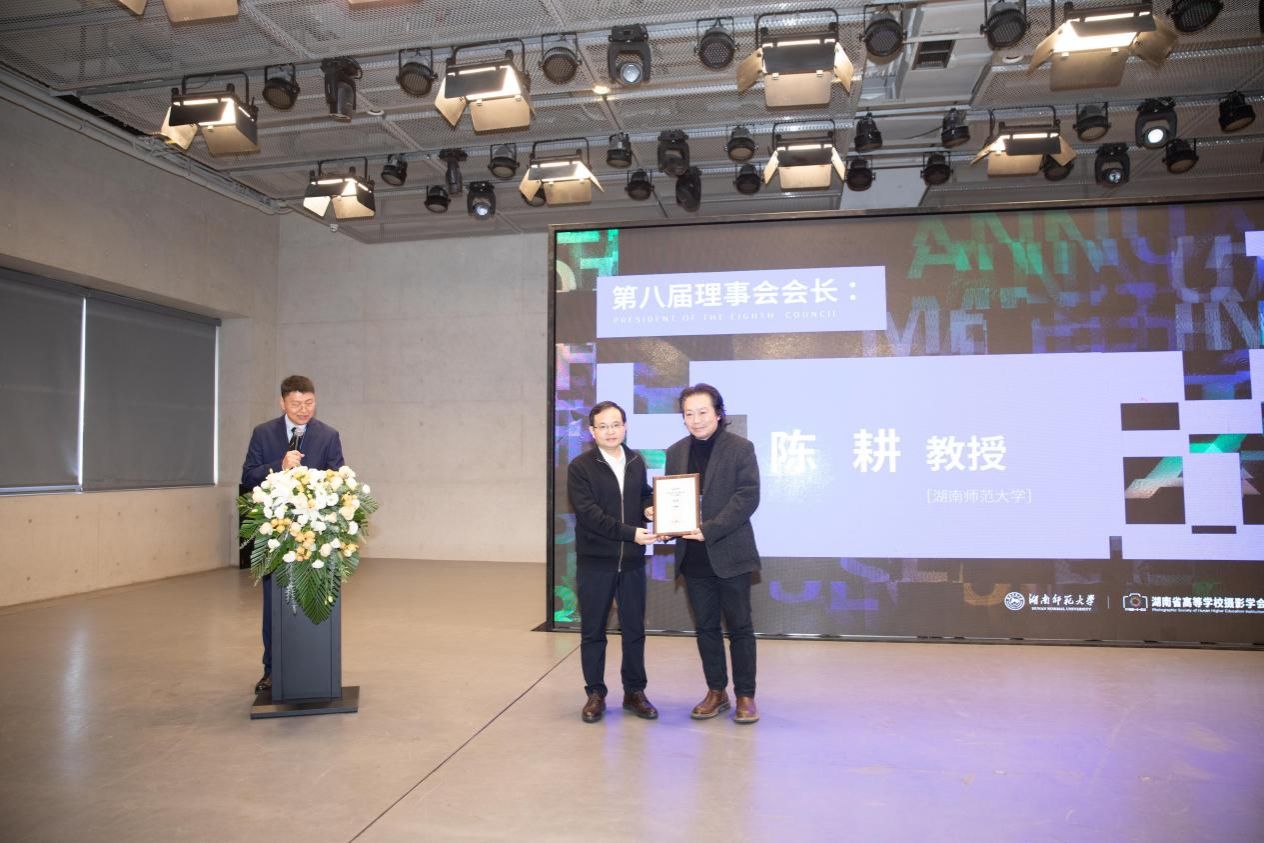 此外,大会还对第八届理事会的成员进行了选举。湖南省高等学校摄影学会第七届理事会秘书长、湖南师范大学吴余青教授代表第七届理事会宣读第八届理事会推选办法,以及理事会提名的第八届理事会正副会长、常务理事、理事、正副秘书长候选人名单。大会通过举手表决的方式选举产生了第八届湖南省高等学校摄影学会正副会长、常务理事、理事、正副秘书长并颁发聘书。湖南师范大学工程与设计学院教授陈耕当选为新一届理事会会长,太阳成官网数字媒体艺术专业教师梁可嘉当选为常务理事,杨智当选为理事。